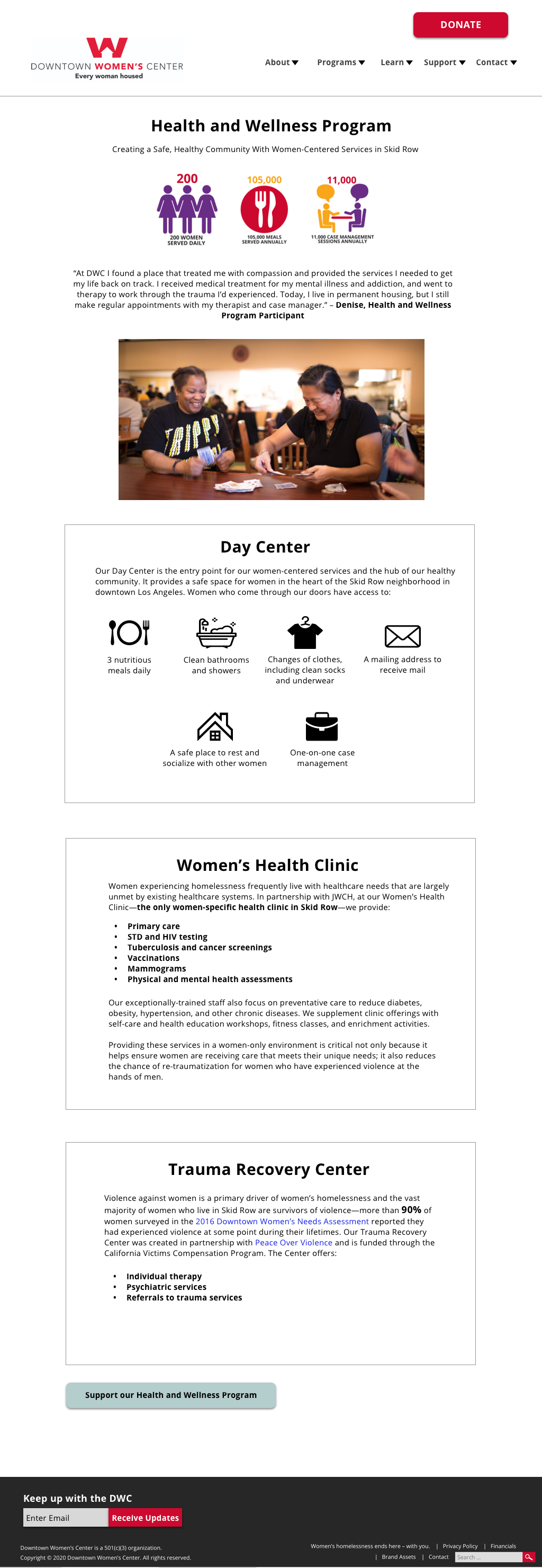 The Downtown LA Women’s Center does amazing work. Their mission is to end homelessness through the advocacy and empowerment of women. In order to keep serving women, their work needs to be communicated to users in the most effective way. The Downtown Women’s Center needed help telling their story, communicating their impact, and reaching more prospective donors, volunteers, and potential partners.